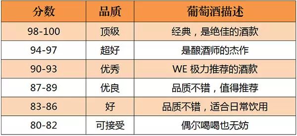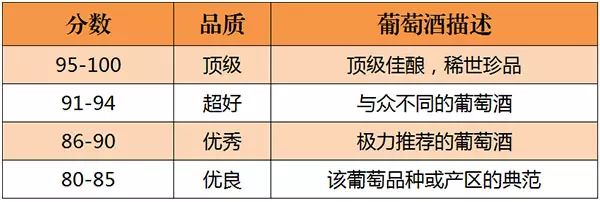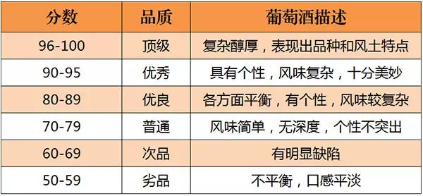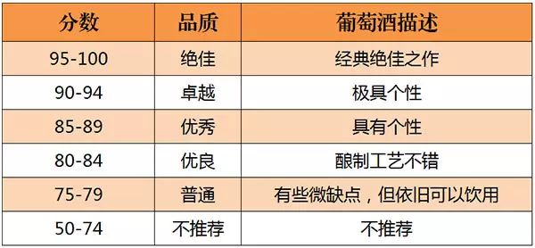 美國(guó)的《葡萄酒與烈酒》(Wine & Spirits)雜志是世界上最權(quán)威的葡萄酒雜志之一。自 1994年起,《葡萄酒與烈酒》也開(kāi)始采取百分制對(duì)葡萄酒進(jìn)行評(píng)分,葡萄酒首先會(huì)經(jīng)過(guò)一些葡萄酒專業(yè)人士進(jìn)行初次品嘗篩選,之后才會(huì)送到專業(yè)“評(píng)酒團(tuán)”品評(píng),所以該雜志評(píng)分的葡萄酒品質(zhì)都不錯(cuò)。評(píng)分標(biāo)準(zhǔn)如下所示: