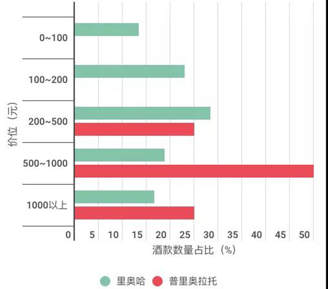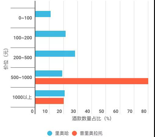 電商平臺(tái)普里奧拉托與里奧哈葡萄酒價(jià)位分布對(duì)比