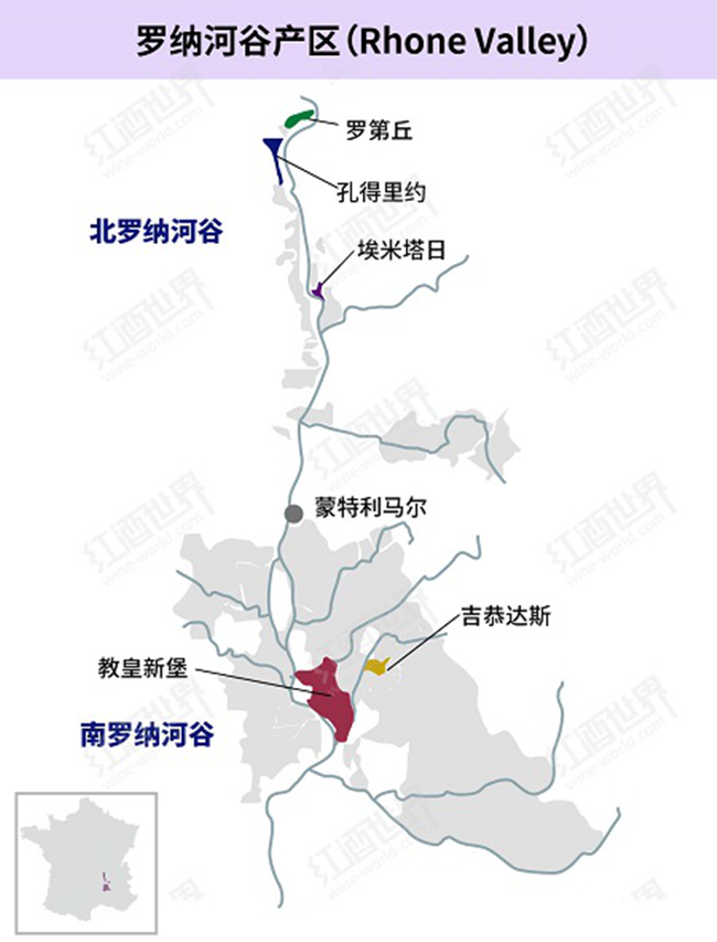 羅納河谷位于法國南部,整體沿著羅納河(Rhone River)由北向南呈條狀分布。這里歷史悠久,一直是法國備受追捧的葡萄酒產(chǎn)區(qū)。因南北區(qū)域的自然環(huán)境差異較大,羅納河谷產(chǎn)區(qū)一般被分成兩個(gè)部分,其中瓦朗斯鎮(zhèn)(Valence)以北為北羅納河谷(North Rhone),蒙特利馬爾鎮(zhèn)(Montelimar)以南為南羅納河谷(South Rhone)。北羅納屬于溫和的大陸性氣候,葡萄園多位于陡峭的山坡上,這里主要生產(chǎn)西拉(Syrah)紅葡萄酒,但也會釀造少量維歐尼(Viognier)、瑚珊(Roussanne)和瑪珊(Marsanne)白葡萄酒。南羅納則屬于地中海氣候,這里炎熱干燥且風(fēng)力強(qiáng)勁,葡萄園的地形更為平坦。南羅納擁有比北羅納更加豐富的葡萄品種,包括西拉、歌海娜(Grenache)、慕合懷特(Mourvedre)和白歌海娜(Grenache Blanc)等。其中,最為重要的是歌海娜,其常與西拉、慕合懷特和神索(Cinsault)等品種一同混釀。