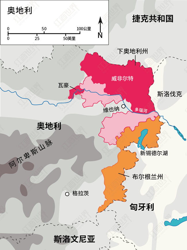 奧地利的葡萄酒產區與勃艮第處于同一緯度,但由于該國位于歐洲中部地區,其氣候比勃艮第更具大陸性特征。北部產區會受到較冷的北風影響,而與匈牙利接壤的東部地區則享有較溫暖的東風。阿爾卑斯山覆蓋著奧地利的西部,因此葡萄種植區主要分布在該國的東部。這些葡萄種植區以涼爽的大陸性氣候為主,冬季嚴寒多雪,夏季溫暖短暫,秋季陽光明媚,本土葡萄品種在這樣的氣候條件下能夠很好地生長。