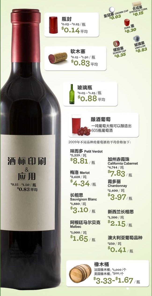 葡萄酒釀出來之后,在到達(dá)消費者手中之前,還必須經(jīng)過包裝、運輸和分銷等過程。葡萄酒的包裝費用包括酒瓶、瓶塞、瓶封、酒標(biāo)和箱子等。不同的瓶塞價格各不相同,比如軟木塞的平均費用是0.83美元/個,而螺旋塞的費用要低不少,只要0.35美元/個。一個玻璃酒瓶需要0.88美元左右……不同的生產(chǎn)商可能采用不同的方式把自己的葡萄酒推上市場,不過,不管選用哪種方式,都需要支付一定的分銷成本。