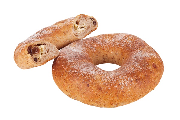 5.拍扁放軟質(zhì)奶油奶酪和提子干,下半折再上折捏合面團(tuán),搓長。將一頭壓扁包入另一頭。(注意不要勉強(qiáng)搓長回縮的話先松弛幾分鐘再搓)