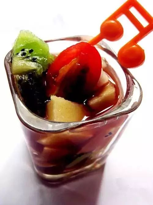3.所有水果丁放入干凈的玻璃器皿,加入白糖和紅葡萄酒;