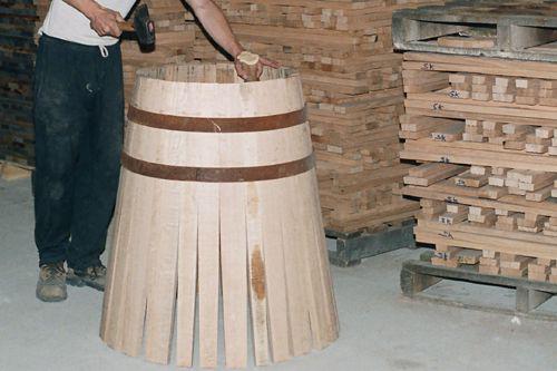 經(jīng)過干燥的橡木,裁成中間寬末端窄的木條,便可開始木桶的組合。一般一個橡木桶需要32片左右的木條,其中較寬的一塊將來會穿一個裝酒的孔。組成裙狀的木條會先用鐵圈固定住一端。由于橡木加熱之后彈性增加,所以散開的另一端在加熱后可以彎曲成弓狀,用鐵圈套住后橡木桶的雛形就大致完成。