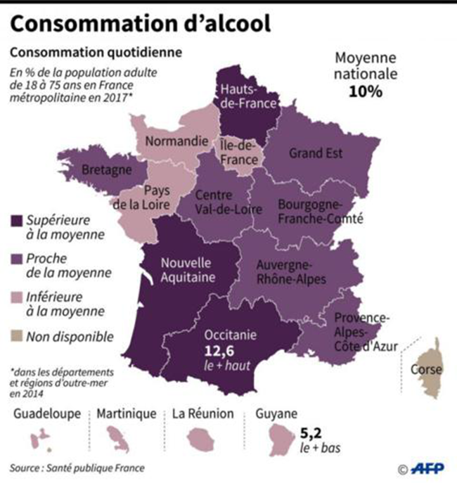 該機(jī)構(gòu)指,法國成年人每日飲酒比例達(dá)10%,巴黎大區(qū)、諾曼底、盧瓦爾地區(qū)以及海外領(lǐng)地居民低于平均值,奧克西塔尼大區(qū)(12.6%)、新阿基坦大區(qū)(12.3%)和上法蘭西大區(qū)(11.5%)居前三位。