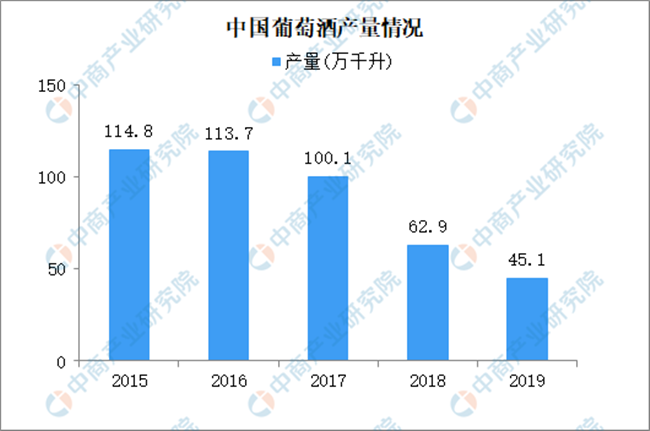 近五年葡萄酒產(chǎn)量接連下滑,2015年葡萄酒產(chǎn)量108.8萬千升,2019年跌至45.1萬千升,跌幅60.7%。
