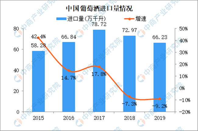 2015-2017年葡萄酒進(jìn)口量穩(wěn)步上漲,但是增速放緩。此后兩年葡萄酒進(jìn)口量持續(xù)下降,2019年葡萄酒進(jìn)口量跌至2016年水平,進(jìn)口量66.23萬千升,同比減少9.2%。