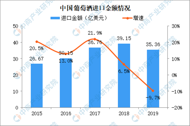 2015-2019年葡萄酒進(jìn)口金額持續(xù)增長,2019年葡萄酒進(jìn)口金額逼近40億美元。2019年葡萄酒進(jìn)口金額小幅下跌,進(jìn)口金額35.36億美元,同比減少9.7%。