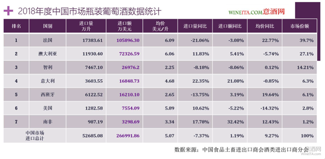 在來自法國的VCE歐餐酒漲價的趨勢下,法國進口總額的跌幅高于進口總量的跌幅,說明法國高價位葡萄酒的進口大幅度萎縮,但是僅從現有數據,無法分析出下滑的是10-50歐元價位的精品酒,還是50歐元以上價位段的名莊葡萄酒。