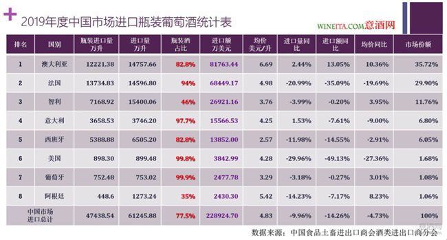 排名第一的澳大利亞瓶裝葡萄酒進口總量為12221.38萬升,進口總額為8.1763億美元,相比2018年分別增長2.44%和13.05%。進口均價為6.69美元/升,相比2018年增長了10.36%。占據了35.72%的市場份額。相比2018年度27.1%的市場份額,增長了近32%。
