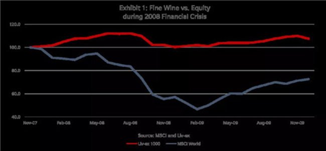 精品葡萄酒投資公司Cult Wines近日也發(fā)布了一份關(guān)于精品葡萄酒投資的統(tǒng)計(jì)分析報(bào)告,報(bào)告稱(chēng)在2007年11月至2009年11月的整個(gè)金融危機(jī)期間,Liv-ex 1000指數(shù)的表現(xiàn)始終優(yōu)于摩根士丹利資本國(guó)際全球指數(shù)(Morgan Stanley Capital International Index,簡(jiǎn)稱(chēng)MSCI指數(shù),是一個(gè)市值加權(quán)股票市場(chǎng)指數(shù))。