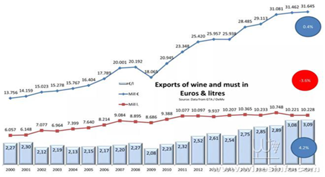 散酒貿(mào)易總量趨于平緩,而總價(jià)方面的上升也開始出現(xiàn)了疲軟的這個(gè)勢(shì)頭。大家越來越希望拿到高質(zhì)量的葡萄酒。作為散酒出口大國(guó),散酒貿(mào)易收縮的局面對(duì)于西班牙的出口是個(gè)威脅。