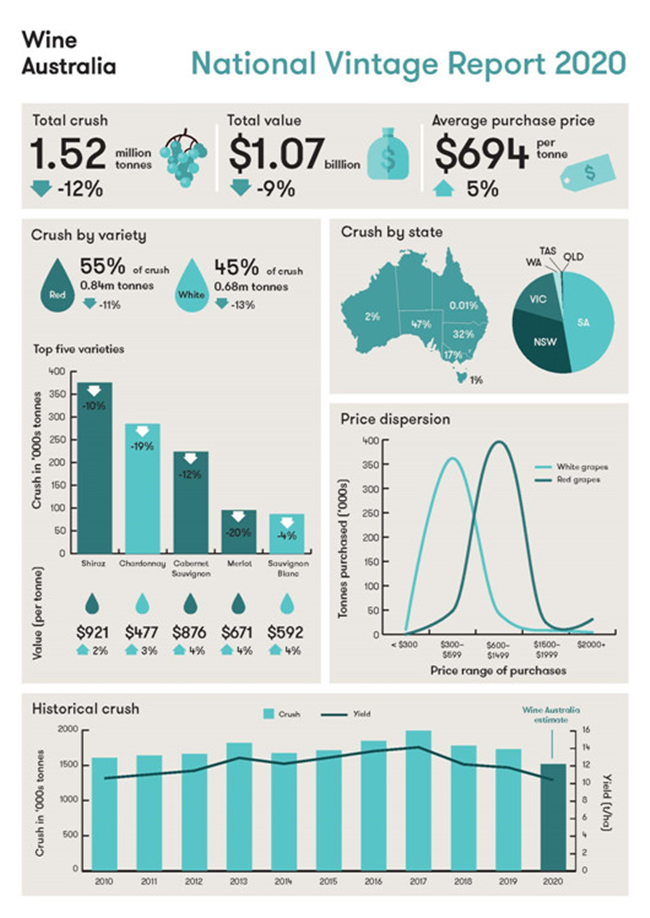 根據澳大利亞葡萄酒管理局在今天(7月7日)發布的2020年《全國釀酒葡萄收獲報告》(National Vintage Report)顯示,2020年澳大利亞的釀酒葡萄收成(壓榨)產量約152萬噸,相當于超過10億升的葡萄酒。