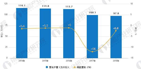 具體來看,2016年全國葡萄酒產(chǎn)量達(dá)113.7萬千升,同比下滑1%。預(yù)計(jì)2018年中國葡萄酒產(chǎn)量將下滑至107.2萬千升。