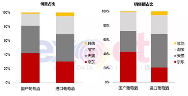 國產(chǎn)及進口葡萄酒各平臺市場份額占比(2017)