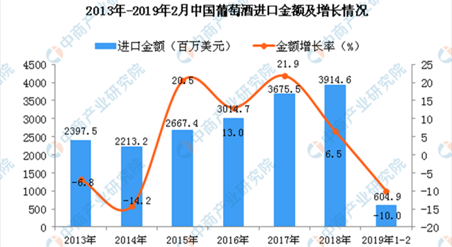 從金額方面來看,2013年-2014年中國葡萄酒進口金額有小幅度下降,2015年-2018年中國葡萄酒進口金額增長;2019年1-2月中國葡萄酒進口金額為604.9百萬美元,同比下降10%。