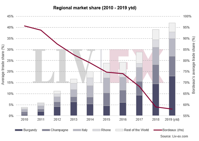 在2018年度報告中,我們發現優質葡萄酒市場不斷擴大,買家對更多不同酒區的葡萄酒的興趣不斷增加。2019年至今,除了這多元化的趨勢繼續保持,勃艮第的交易份額也創新高。