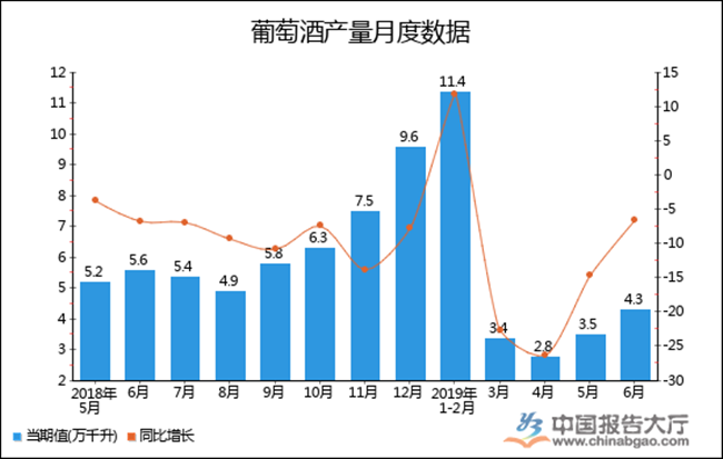 根據(jù)中國(guó)報(bào)告大廳對(duì)2019年1-6月全國(guó)葡萄酒產(chǎn)量進(jìn)行監(jiān)測(cè)統(tǒng)計(jì)顯示:2019年6月全國(guó)葡萄酒產(chǎn)量4.3萬(wàn)千升,同比下降6.5%,2019年1-6月全國(guó)葡萄酒產(chǎn)量為24.5萬(wàn)千升,累計(jì)下降19.9%。