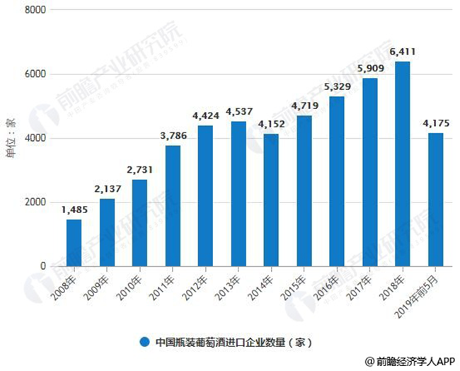 2008-2019年前5月中國瓶裝葡萄酒進口企業(yè)數(shù)量統(tǒng)計情況