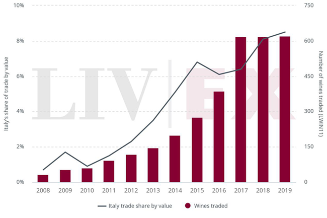 市場對意大利葡萄酒的興趣日益,這可從曝光率(出價和報價的總值)不斷上升上體現;這是市場上買賣葡萄酒的承諾指標。
