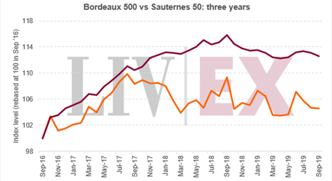 在過去三年,一向走勢緩慢的蘇玳50指數上升4.6%。同期,更廣泛的波爾多500指數則已上升12.6%。