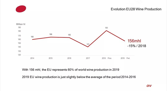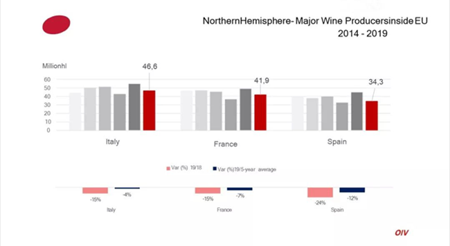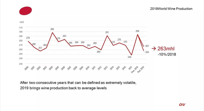 據(jù)國際葡萄與葡萄酒組織(OIV)最新數(shù)據(jù)顯示,2019年全球葡萄酒產(chǎn)量為263億升(mhl),同比2018年下降了10.54%。包括法國、意大利、西班牙在內(nèi)的葡萄酒主產(chǎn)國產(chǎn)量均有不同程度下降。OIV的數(shù)據(jù)來自28個(gè)國家,占全球葡萄酒產(chǎn)量的85%。
