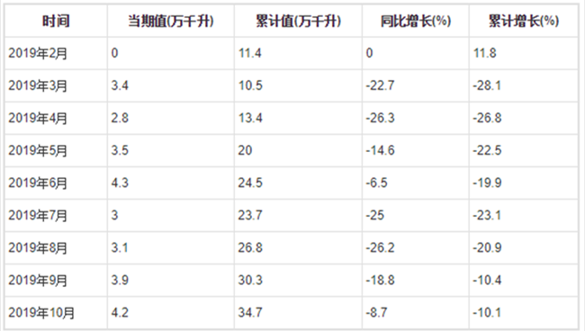2019年1-10月全國葡萄酒產量分月數(shù)據(jù)