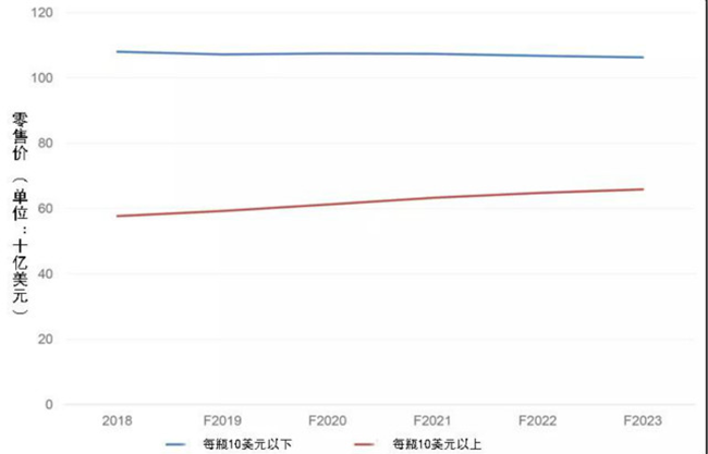 根據預測,按價格點算,每瓶10美元以下的葡萄酒全球銷量將下降,其中銷量下降0.6%,銷售額下降0.3%。(見表一)相比之下,每瓶售價在10美元以上的葡萄酒,預計銷量和銷售額都將增長,每年增長率分別為2.6%和2.7%。