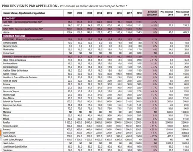 1) 漲幅高達(dá)+22%的圣艾斯戴夫產(chǎn)區(qū)(St. Estèphe),由2017年的45萬(wàn)歐元/公頃上漲到2018年的55萬(wàn)歐元/公頃。