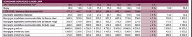 博艮第產(chǎn)區(qū)金丘所有AOP葡萄園都呈上漲趨勢(shì),漲幅也都很均勻,在2%到5%之間。其中漲幅最大的兩個(gè)AOP產(chǎn)區(qū)分別是“博艮第大區(qū)級(jí)別(Bourgogne Appellation Régionale)”,由2017年的4.1萬(wàn)歐元/公頃上漲到2018年的4.3萬(wàn)歐元/公頃,漲幅高達(dá)5%。另外一個(gè)漲幅高達(dá)5%的產(chǎn)區(qū)是“博艮第一級(jí)紅葡萄園”(Bourgogne 1er Cru rouge),由2017年的65萬(wàn)歐元/公頃上漲到2018年的68萬(wàn)歐元/公頃。