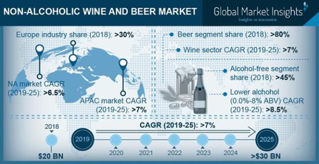 根據(jù)全球市場洞察(Global Market Insights)2019年發(fā)布的報告,2018年無醇葡萄酒和無醇啤酒市場規(guī)模為200億美元,預(yù)計從2019年到2025年,年復(fù)合增長率將超過7%,達300億美元,以下是部分數(shù)據(jù):