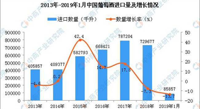 • 據中商產業研究院數據庫顯示,2013年-2017年中國葡萄酒進口量增長,共增長381347千升,增長93.96%;2018年中國葡萄酒進口量回落,2019年1月中國葡萄酒進口量為85857千升,同比下降13.7%。 從金額方面來看,2013年-2014年中國葡萄酒進口金額有小幅度下降,2015...