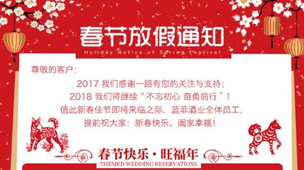• 尊敬的藍菲代理商朋友們: 新年的鐘聲即將敲響,根據國家春節假期通知及藍菲公司的實際情況, 確定于2018年2月9日-2月22日,共14天,為藍菲酒業春節假期,于2018年2月23日(正月初八)正式上班,請好朋友們悉知。 同時在此提前恭祝,新春快樂! 2017年是非同尋...